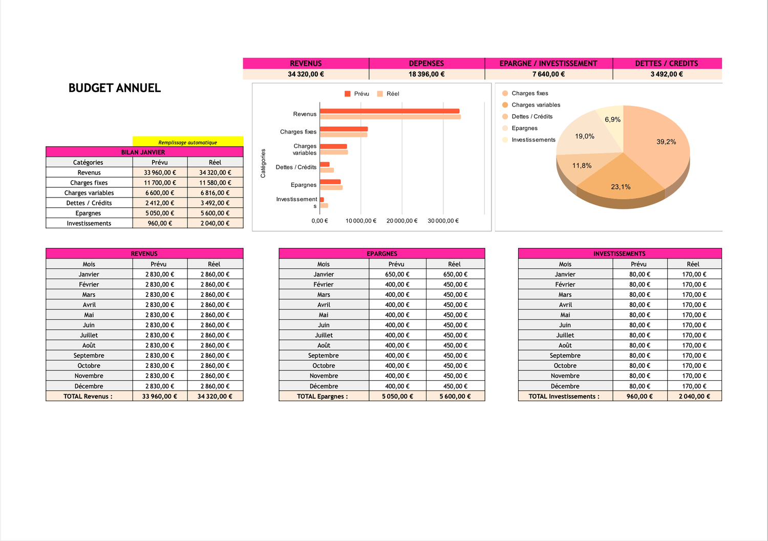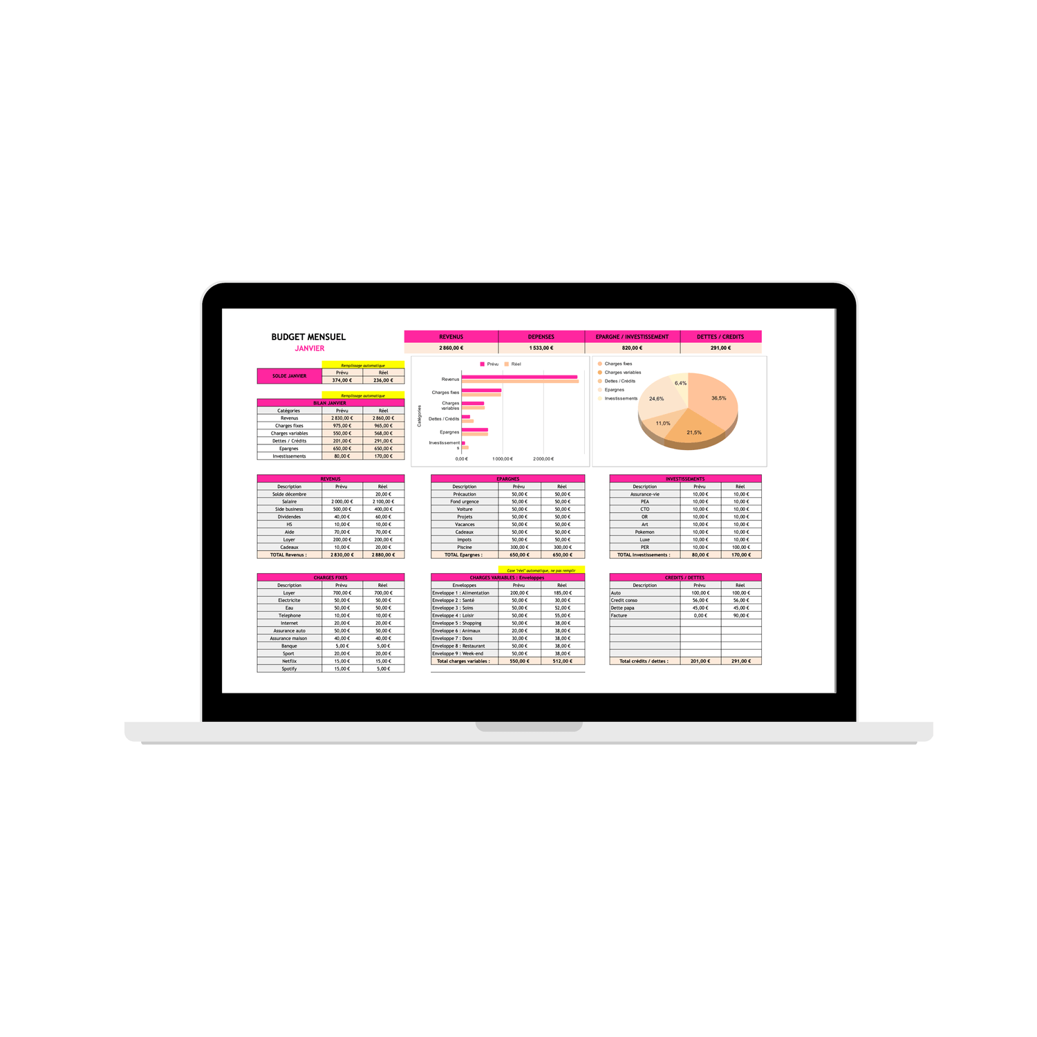 Ces tableaux ont été conçus pour être clairs et intuitifs. Pas besoin d’être une experte en finance : tout est guidé pour que tu puisses rapidement suivre tes dépenses, épargner et gérer ton budget. Tu sauras en quelques clics où va ton argent chaque mois.