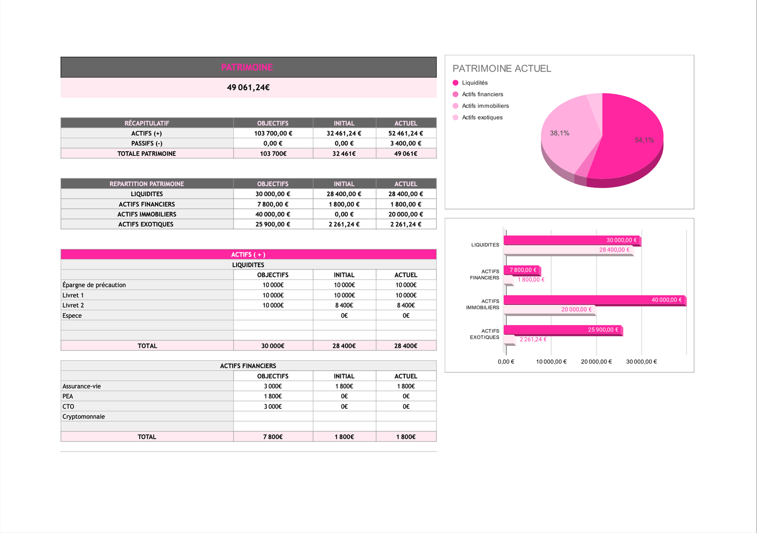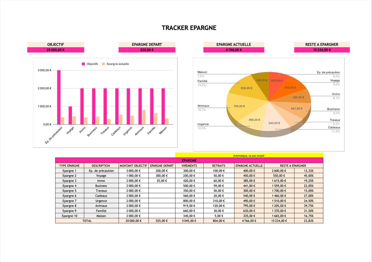 Avec le tableau d’épargne, tu visualises tes progrès en temps réel. Que ce soit pour un voyage, un projet immo ou ton fond d’urgence, tu peux enfin mettre de côté de manière motivante et concrète.